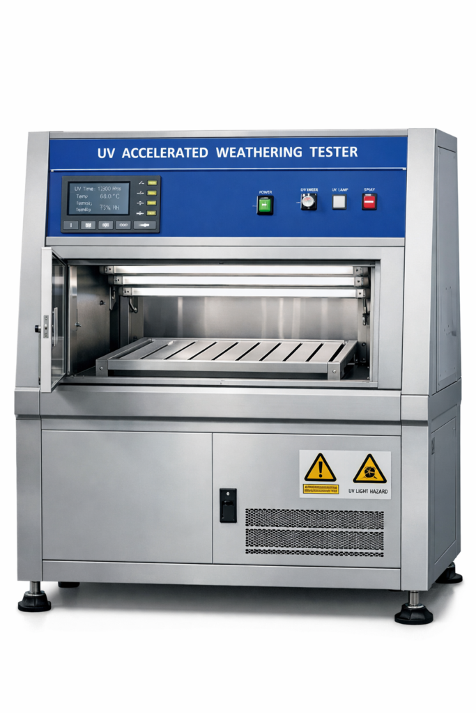 A UV Accelerated Weathering Tester is a laboratory testing instrument used to simulate long-term outdoor weathering effects—such as sunlight, rain, heat, and humidity—on materials within a short time to evaluate durability and aging performance.The tester uses UV lamps to replicate sunlight and controlled cycles of moisture and temperature to assess material degradation like color fading, cracking, chalking, and loss of strength…